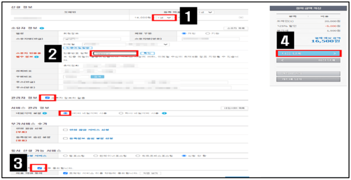 신청 정보 입력 : 신청 > 소유자 > 관리자 > 부가 서비스 > 동시 신청 > 약관 동의 > 다음 단계